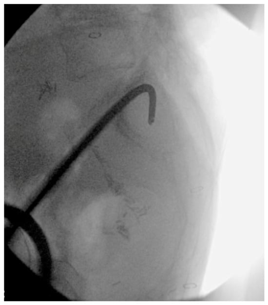 Intraoperative lateral sacral fluoroscopic view with starting wire.