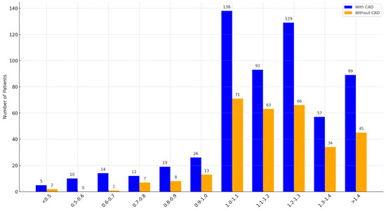 Ankle–brachial index (ABI) analysis showed the strongest CAD associations in ranges of 0.5–0.6 (p = 0.049, OR = 2.23, 95% CI: 1.00–4.98) and 0.6–0.7 (p = 0.045, OR = 2.07, 95% CI: 1.01–4.23), although smaller sample sizes in lower ABI ranges may have affected reliability (Figure 1).