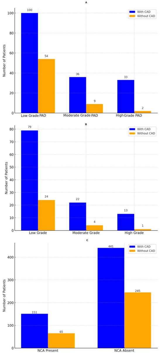 The figure presents the prevalence and associations of coronary artery disease (CAD) across different vascular conditions. Panel (A) illustrates the distribution of CAD among patients with low-, moderate-, and high-grade peripheral arterial disease (PAD). Blue bars represent patients with CAD, while orange bars represent those without CAD, with patient counts displayed above each bar. Panel (B) depicts CAD prevalence across internal carotid artery stenosis grades (low, moderate, and high). Blue bars correspond to CAD-positive patients, while orange bars correspond to CAD-negative patients, with the total number of patients annotated for clarity. Panel (C) highlights the association of non-compressible arteries (NCAs) with CAD, showing the number of patients with and without CAD in groups with NCAs present and NCAs absent. Blue bars represent CAD-positive patients, while orange bars indicate CAD-negative patients, with exact patient counts labeled above each bar.