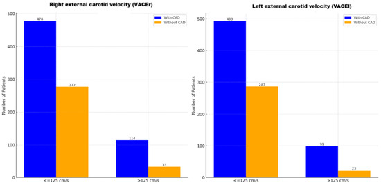 Association between left and right external carotid artery velocities (VACEl, VACEr) and coronary artery disease (CAD) (≤125 cm/s vs. >125 cm/s). The bar charts display the distribution of CAD among patients based on right external carotid velocity (VACEr) and left external carotid velocity (VACEl). Blue bars represent patients with CAD, while orange bars represent patients without CAD. Carotid velocities are categorized for analysis into two groups: ≤125 cm/s and >125 cm/s.