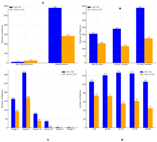 This figure shows the relationship between CAD prevalence and key demographic and lifestyle risk factors: hypertension, smoking history, CKD stages, and age. Panel (A): CAD prevalence in hypertensive versus non-hypertensive patients, with a significantly higher prevalence in hypertensive individuals. Panel (B): CAD prevalence across smoking history categories, highlighting the highest prevalence in current smokers. Panel (C): CAD prevalence across CKD stages, with advanced CKD stages showing a marked increase in CAD risk. Panel (D): CAD prevalence by age group, demonstrating an age-related increase in CAD prevalence, with the highest rates in the oldest age group.