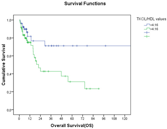 Conversely, lower levels of HDL-C and higher TC/HDL-C ratios were associated with poorer survival outcomes, particularly in patients with advanced-stage disease. The TC/HDL-C ratio has been proposed as a potential prognostic marker in various cancers, including CRC, reflecting a more pro-inflammatory lipid environment that could contribute to tumor growth and metastasis [28,29].