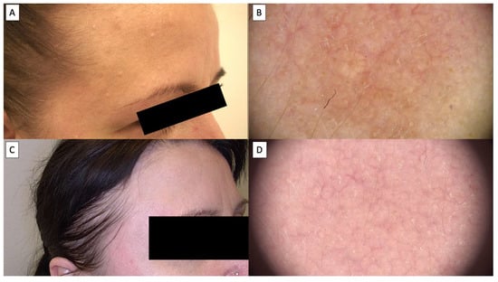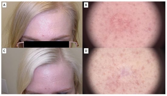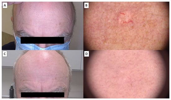 Dermoscopic assessment after HIFU therapy showed that the majority of patients achieved complete resolution of sebaceous hyperplasia, as depicted in Figure 2, Figure 3, Figure 4 and Figure 5. Notably, the characteristic dermoscopic appearance of these lesions as whitish-yellowish nodular structures encircled by a distinct vascular pattern known as the “crown sign” was observed to resolve following treatment. Figure 2 illustrates an ideal healing process with an excellent post-procedural outcome, both macroscopically (C) and dermatoscopically (D). While most cases resulted in total lesion clearance without any adverse effects, a subset of patients developed minor side effects, which were meticulously documented in Table 1. Figure 3 shows an SH lesion previously treated with a CO2 laser in a female patient, which recurred after one month. In our case, the lesion was completely removed both macroscopically (C) and dermatoscopically (D). However, white lines indicating scarring are visible. Other side effects included the formation of small telangiectasias, indicated by Figure 5, as well as minor scarring and hyperpigmentation, all of which were localized and limited to the area of treatment. Figure 4 shows the complete macroscopic removal of the lesion (C). However, under dermatoscope (D), a small remnant of a large arborizing vessel is visible. The lesion requires further follow-up to exclude potential recurrence in the future. This also highlights the role of dermoscopy in monitoring treatment outcomes and detecting lesions with a higher risk of recurrence.