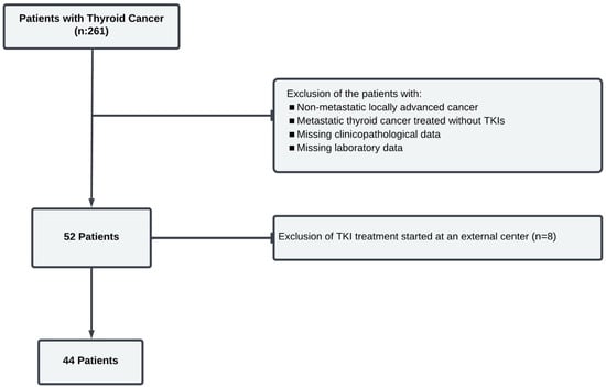 Eighty-three patients aged 18 years and older, diagnosed with metastatic thyroid cancer, were followed-up at the Bursa Uludag University Endocrinology Department from January 2010 to June 2024. Patients with a diagnosis of metastatic thyroid cancer who did not use tyrosine kinase inhibitors and who started first-line treatment at an external center were excluded from the study. The patient flowchart is illustrated in Figure 1.