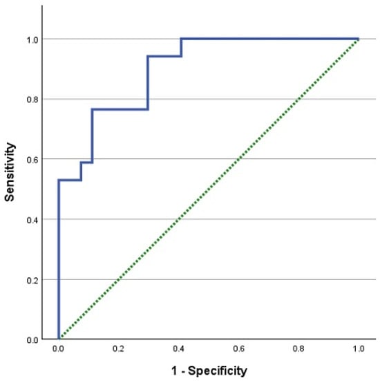 The patients’ demographic characteristics and laboratory parameters according to the pathological subtypes of metastatic thyroid cancer are presented in Table 1. Although the frequency of female patients was higher in those with follicular thyroid carcinoma, the male gender ratio was higher in the other two subtypes; however, no statistically significant difference was detected between the groups (p = 0.324). Moreover, there was no statistically significant difference between the groups regarding the age at which TKI therapy was initiated and the time from the diagnosis of metastatic thyroid cancer to the start of TKI treatment. No statistically significant differences were found between the groups regarding the rate of visceral metastasis, laboratory parameters at the start of TKI treatment, inflammation, or nutritional scores (p > 0.05). According to receiver operating characteristic (ROC) curve analysis, the cut-off value of the HALP score for predicting mortality was 29.21 (AUC: 0.90, sensitivity: 76.5%, specificity: 88.9%, p < 0.001). The results of the ROC analysis are depicted in Figure 2. Patients with a HALP score of ≤29.21 were defined as the HALPlow group, and those with a HALP score of >29.21 were defined as the HALPhigh group.