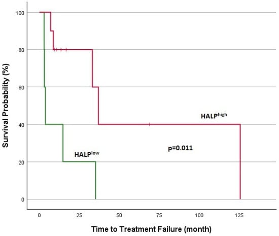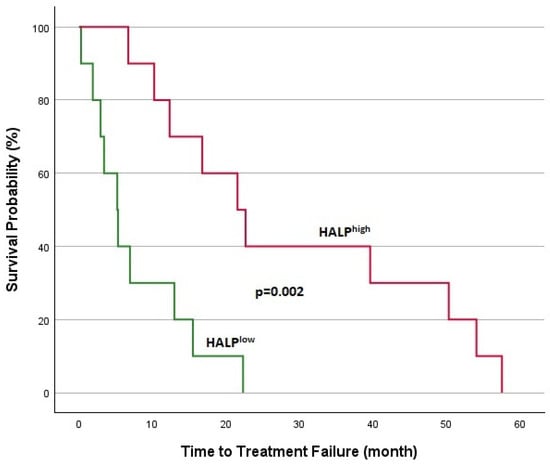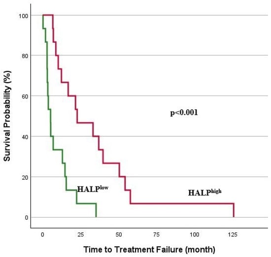 The findings from the Cox regression analysis for TTF are provided in Table 3. In the univariate analysis, HALP score (low vs. high), total leukocyte count, neutrophil count, and hemoglobin levels were found to be significant. In the multivariate analysis, low HALP scores and leukocyte counts were identified as independent variables associated with shorter TTF (HR: 0.272, HR: 1.185; p = 0.011, p = 0.005). Other variables were not statistically significant.