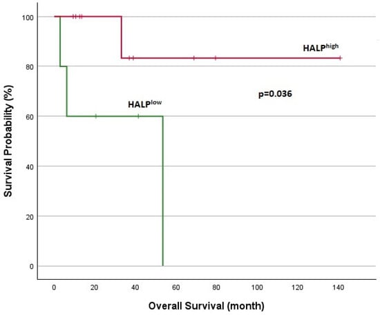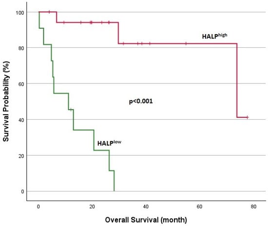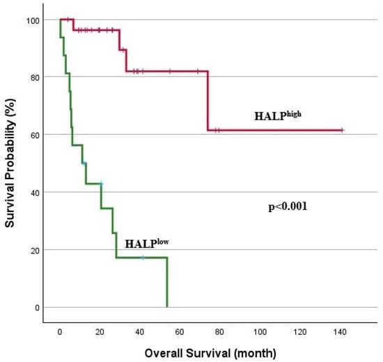 The median follow-up period for the study group was 20.2 months (range: 0.3–140.8), and survival analyses for TTF and OS are illustrated in Figure 3 and Figure 4. A log-rank analysis revealed that the median TTF was significantly lower in the HALPlow group (5.2 months vs. 22.6 months; p < 0.001). Similarly, an OS analysis showed significantly lower overall survival in the HALPlow group (p < 0.001). In the HALPlow group, the median OS was 11.1 months, whereas the median survival was not reached in the HALPhigh group. The 1-year OS rate was 50% in the HALPlow group compared to 96.3% in the HALPhigh group.