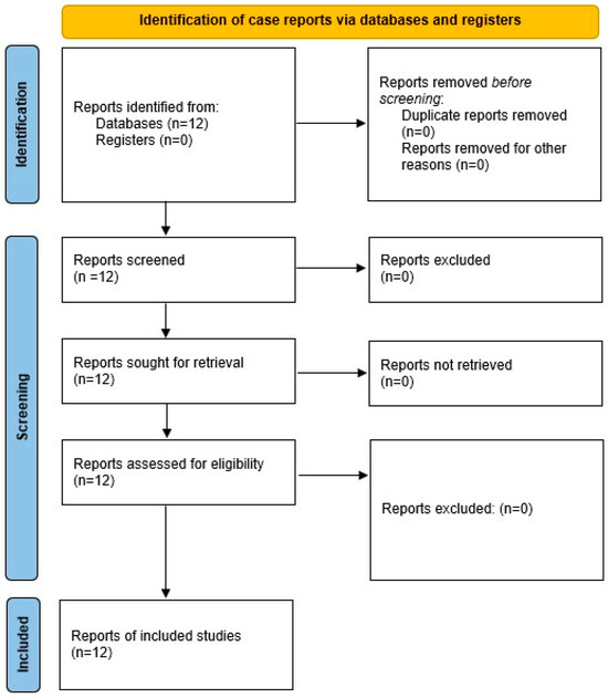 Twelve cases of FES treated with ECMO over a 20-year period were identified through database searches (Table 1), and after screening, all met the inclusion criteria for review and were included in the final analysis (Figure 1). As outlined in Table 2, the cohort had a mean age of 51.08 ± 24.49 years (range: 24–90), with 8/12 (66.66%) of the patients being male. Only two cases explicitly reported proning, but all patients received lung-protective ventilation before ECMO. Both V-A and V-V ECMO were utilized equally, with each mode used in six (50%) cases. The mean time from the onset of refractory hypoxemia to ECMO initiation was 13.8 ± 5.3 h, and the mean ECMO duration was 136.08 ± 73.31 h (range: 65–288). ECMO therapy led to a significant improvement in oxygenation, with the mean PaO2/FiO2 ratio increasing from 69.7 ± 15.4 to 205.5 ± 19.2 post-ECMO, representing a +135.8 improvement. Complications were reported in 9 out of 12 (75%) cases, while survival following ECMO therapy—the primary outcome—was achieved in 11 cases; the remaining patient did not survive due to complications, including disseminated intravascular coagulation and ECMO circuit failure.