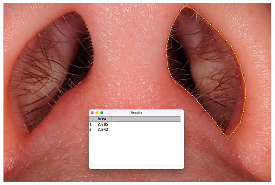 Example of how nostril was measured by the observers. The right and left nasal apertures were outlined using ImageJ® 1.54 software, and the areas of each nostril were calculated in square units. Observers were blinded to the patients’ reported chewing side during this measurement process to ensure unbiased analysis.