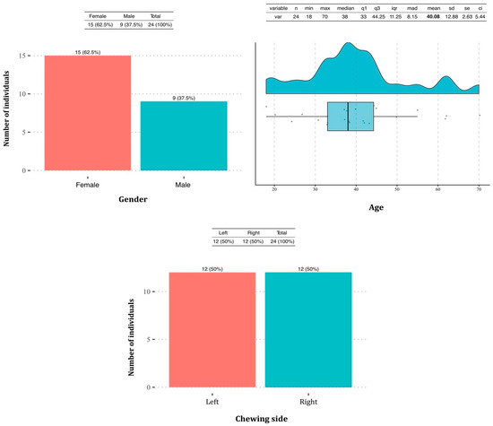 Descriptive analysis of the study population. The first graph illustrates the distribution of participants by gender, showing 62.5% females (n = 15) and 37.5% males (n = 9). The second graph represents the age distribution, with a median of 38 years and an interquartile range of 33 to 44 years. The third graph displays the distribution of the preferred chewing side, with an equal distribution of participants favoring the left (50%, n = 12) and right (50%, n = 12) sides.