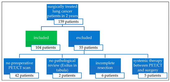 This study was conducted at a university hospital and tertiary referral center in Germany. Over a period of two years, thoracic surgery for the treatment of lung cancer was performed in 159 patients. A total of 104 patients (65.4%) who underwent a preoperative whole-body PET/CT to complete disease staging were included in the study and evaluated retrospectively (64 male, 40 female; median age 67.0 years, range 46–83 years). Patients who had PET/CT performed elsewhere, who received induction chemotherapy and/or radiation therapy, and patients with incomplete resection of the primary tumor or without histopathological processing of the specimen were excluded (Figure 1).