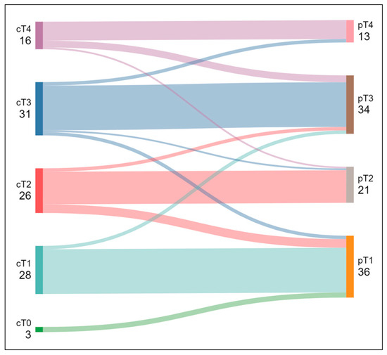 Changes in T category from preoperative PET/CT (left) to postoperative histopathology (right). In three cases, the lung lesion did not show glucose hypermetabolism on PET/CT (cT0). Subclassifications are not shown for clarity.