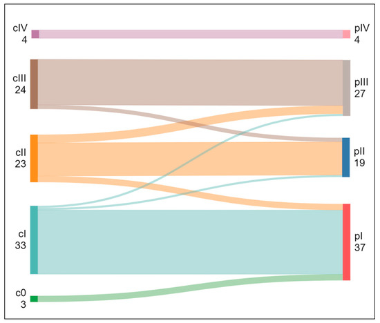 Changes in disease stage from preoperative PET/CT (c) to postoperative histopathology (p). Subclassifications are not shown for clarity.