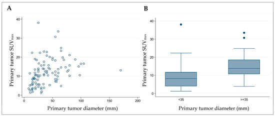 - Diameter of the primary tumor: An increasing diameter of the primary tumor was statistically significantly associated with a higher SUVmax (p < 0.001; Figure 4A). Categorized into primary tumor diameters below and above 35 mm, SUVmax values were statistically significantly different (p < 0.001) (Figure 4B). For primary tumors below 35 mm (51 patients), the mean SUVmax was 9.1 ± 6.7; for those above 35 mm (53 patients), it was 10.6 ± 6.2.