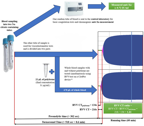Workflow summary illustrated by a real measurement. In this real case, the RVV CT ratio is 1.61, being above 1.6; therefore, the estimated anti-Xa is above 0.6 IU/mL. The measured anti-Xa activity using the chromogenic method is 0.72. Turnaround time = preanalytic time (≈302 s) + longer duration of the RVV CTs measured in the presence and absence of polybrene (134 s < 216 s) = 302 + 216 = 518 s ≈ 8.6 min. * The CloPro device has 6 independent channels, so 6 measurements can be performed in parallel at the same time.