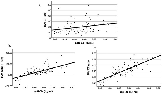 Bivariate correlations between anti-Xa values and RVV CT (a), RVV deltaCT (b) and RVV CT ratio (c). RVV delta CT = RVV CT without polybrene—RVV CT with polybrene. RVV CT ratio = RVV CT without polybrene/RVV CT with polybrene. RVV CT and deltaCT are given in seconds; RVV CT ratio has no dimension. Anti-Xa values are given in IU/mL. Pearson correlation coefficients and p-values are as follows: RVV CT (a) r = 0.240, p = 0.032; RVV deltaCT (b) r = 0.699, p < 0.001; RVV CT ratio r = 0.774, p < 0.001.