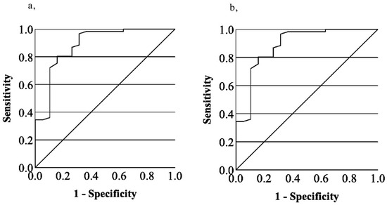 Receiver operating characteristics (ROC) curves for RVV CT ratio and anti-Xa cut off values of 0.3 IU/mL (a) and 0.6 IU/mL (b). AUC for 0.3 IU/mL anti-Xa was 0.885 (95% CI 0.789 to 0.981), p < 0.001. AUC for 0.6 IU/mL anti-Xa was 0.870 (95% CI 0.794 to 0.947), p < 0.001.