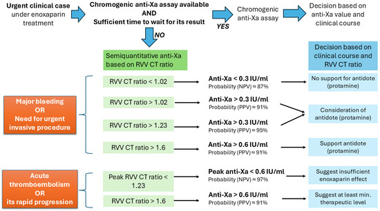 In urgent cases, when chromogenic anti-Xa assay is not available or there is no time to wait for its result, these limits can help guide key decisions. Protamine sulfate is the commonly used partial antidote of LMWHs exerting its effect by electrostatic binding to anionic heparins [38,39,40,41]. However, protamine remaining in excess of an oversized dose provides an anticoagulant effect by inhibition of coagulation, enhanced fibrinolysis and impairment of platelet function [39]. Thus, unnecessary use or overdose of protamine should be avoided. Therefore, in our institute, if the RVV CT ratio is above 1.23 (anti-Xa > 0.3 IU/mL), especially if it is above 1.6 (anti-Xa > 0.6 IU/mL), a meaningful enoxaparin effect can be assumed and the administration of an antidote should be considered in case of major bleeding. In the acute phase of arterial or venous thromboembolism treated with enoxaparin, an RVV CT ratio below 1.23 (anti-Xa < 0.6 IU/mL) may suggest insufficient enoxaparin effects. In case of urgent major surgery of a patient receiving enoxaparin, reasonable delay of surgery or the administration of an antidote is supported if the RVV CT ratio is above 1.6 (anti-Xa > 0.6 IU/mL), while no meaningful enoxaparin effect is expected and protamine sulfate may be avoided if the RVV CT ratio is below 1.02 (anti-Xa < 0.3 IU/mL) (Figure 4). Each case undoubtedly requires an individual assessment and the RVV CT ratio should always be evaluated together with the clinical course.