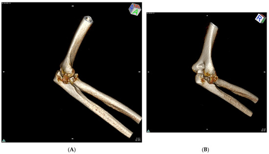 Example of a CT scan (three-dimensional volume reconstruction) showing a Mason type III radial head fracture with significant fracture displacement—P.O. 35y (A,B).