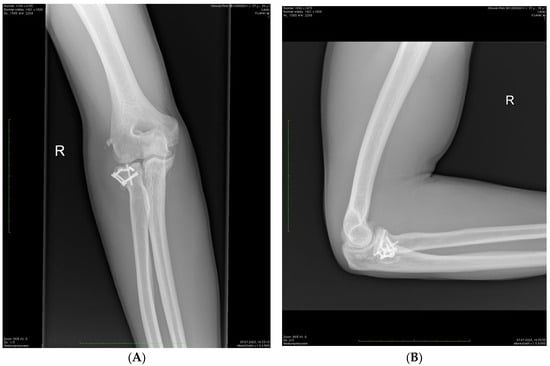 - Jakobi, T.; Krieg, I.; Gramlich, Y.; Sauter, M.; Schnetz, M.; Hoffmann, R.; Klug, A. The outcomes of surgical treatment of complex radial head fractures. Bone Jt. J 2024, 106, 1158–1164. [Google Scholar] [CrossRef]