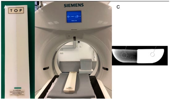 (A) The 2-element calibration phantom. (B) The CT with the calibration phantom. In (C), the images are shown after the CT scan.