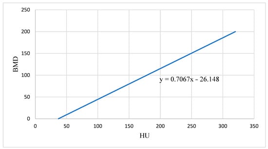 Statistical analysis was performed using IBM SPSS Statistics for Windows, Version 27.0 (IBM Corp., Armonk, NY, USA). To convert HUs to BMD values, a phantomless HU-to-BMD conversion equation was used. The normal distribution of the data was checked using the Kolmogorov–Smirnov test. The significance level α was set at 0.05, with p-values < 0.05 considered significant.