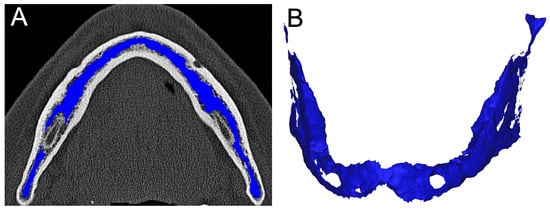 Segmentation example for mandibular BMD calculation. (A) An axial reformation of the CT dataset and (B) a 3D reconstruction with bone marrow colored blue. This figure visualizes which anatomic regions form the mandibular BMD.