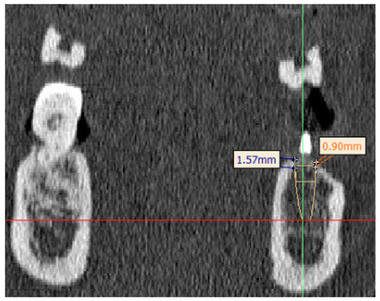 At the same location, the vestibular and lingual cortical thickness at the level of the implant shoulder was measured.