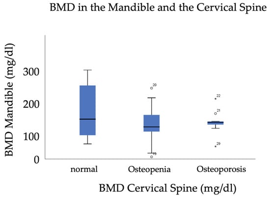 Distribution of mandibular BMD in patients with normal, osteopenic, and osteoporotic BMD in the cervical spine. Circles and * represent outliers from the median.