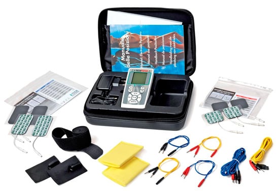 The EG performed teleprehab using NEMS therapy supervised by a physiotherapist. Participants employed a programmable medical device (I-TECH PHYSIO, IACER srl, Scorzè, Venice, Italy) (Figure 1) equipped with two independent channels and four pairs of pre-gelled 130 × 76 mm electrodes (TOP-RANK Health Care Co., Ltd., Shaoxing, China). The device was delivered directly to the patients’ home and picked up at the end of the program.