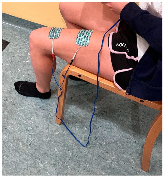 During the supervised session, a single channel was utilized with electrodes positioned on the quadriceps (Figure 2): the lower electrode 4 cm above the patella and the upper electrode 4 cm above the lower one.