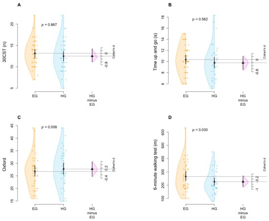 The 30 s Chair Stand test (30CST, (A)), Time Up and Go (B), Oxford scale (C) and Six-Minute Walking Test (D) differences are displayed by Gardner–Altman plots, which show a representation of observed values by the two-group comparison (EG vs. HG), a bootstrap effect size (Cohen’s d) estimation, mean and 95% confidence interval. Two-sided p values were obtained from a generalized linear mixed model evaluating the differences between groups adjusting for sex and age.