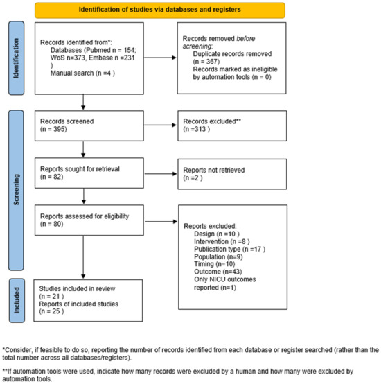 The search strategy resulted in 154 PubMed, 373 Web of Science and 231 EMBASE articles. After duplicates were removed, 395 articles were screened on title and abstract, resulting in 82 articles for full-text screening and 21 for final inclusion. After manual screening of reference tables, we added another 4 articles. In total, we included 25 articles in this review (see Figure 1 for flow chart) [11,12,13,14,15,16,17,18,19,20,21,22,23,24,25,26,27,28,29,30,31,32,33,34,35]. These 25 articles covered 21 unique studies.