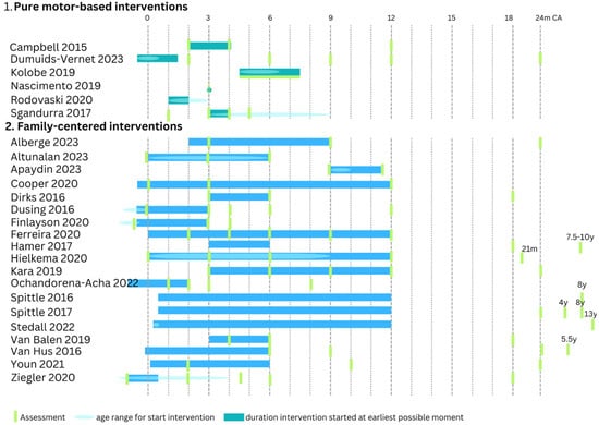 Overview of (1) pure motor-based interventions and (2) family-centered interventions. For the age to start the intervention, a range of ages was often used; this is indicated with a light blue ellipse. When a study started at a fixed age, no ellipse was drawn. The duration of an intervention is indicated with a bar assuming the earliest possible moment of starting. When the intervention starts at an older age (within the age range for the start of the intervention), the entire bar shifts towards the new starting age [11,12,13,14,15,16,17,18,19,20,21,22,23,24,25,26,27,28,29,30,31,32,33,34,35]. CA = corrected age, y = year, m = months.