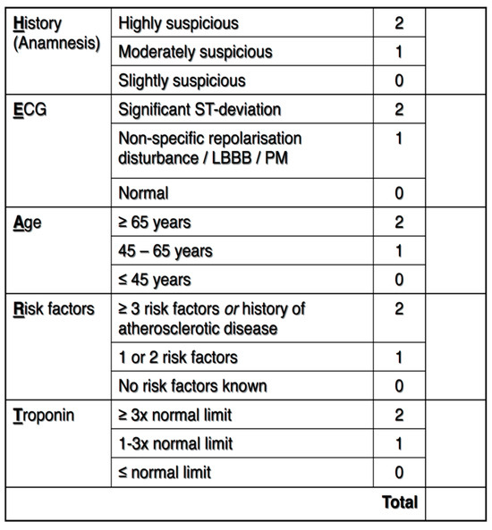 5]. The HEART score is one scoring pathway for risk stratifying patients presenting to the emergency room. Six-week major adverse cardiac events (MACE) occurred in 1.7% of low-score patients (0–3), 16.6% of intermediate scores (4–6), and 50.1% of high scores (7–10) [
