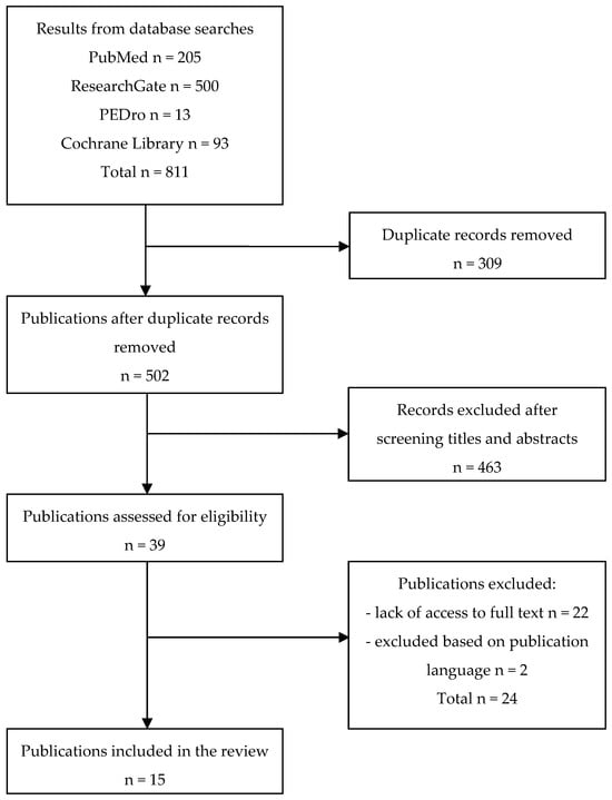 As a result of searching the literature, 811 records were found. After removing duplicates, 502 publications were eligible for screening. Following title and abstract screening, 39 articles were eligible for full-text assessment. After meeting the inclusion criteria, 15 articles qualified for the review. Figure 2 presents a flow diagram demonstrating the scoping review process.