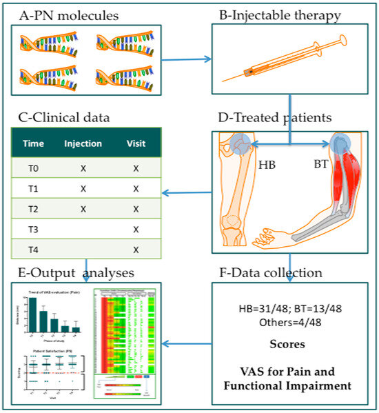 A working plan of the data analysis. All patients included in the data analysis study were treated with Polynucleotide HPTTM (A) injections (B). The patients received three injections (C), and the clinical data were acquired five times (T0–T4). A total of 48 records were analyzed: 31 for hip bursitis (HB) and 13 for biceps tendinitis (BT) (D). The visual analog scale (VAS) score was used to quantify both pain and functional impairment variations (F). Significant statistical differences are reported in graph bars, graph plots, and heat maps (E).