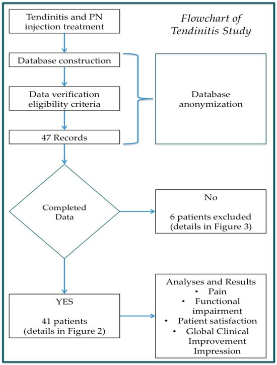 The GraphPad 8.0 version for Apple Computer was used for statistical analysis (PRISM, San Diego, CA, USA). The Wilcoxon rank test was used to compare the differences between before and after the treatment in the degree of clinical improvements in tendinopathies and patient satisfaction. Non-parametrical tests (Kruskal–Wallis) were applied for group comparisons of the variables. One-way ANOVA was performed in order to compare the variation in the data across the visits. The final results were outlined with heatmap representations. All the parameters measured in this study were evaluated by using the classical descriptive statistics of the mean, SD, minimum and maximum (for quantitative variables), and frequencies (for qualitative variables). All statistical results were considered significant if the p-value was less than 0.05 (p < 0.05). The Shapiro–Wilk test was performed in order to determine whether the data were parametrically distributed. Both W- and p-values for the BMI data were calculated (W = 0.980 and p = 0.574). These values justified the implementation of parametric tests for the BMI analyses. The flowcahart of complete procedures is reported below (Figure 2).