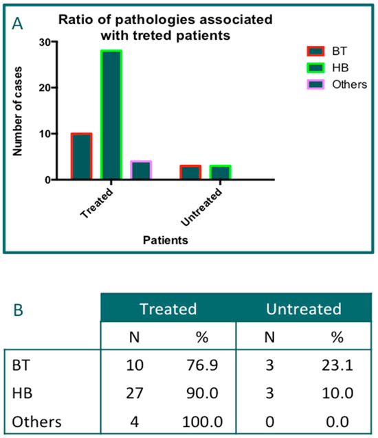 An analysis of the pathological conditions treated. (A): a bar graph showing the distribution of the pathologies. (B): a table reporting the percentages of completion of the treatment scheme. A total of 48 pathological sites were reported. One patient had bi-lateral HB.