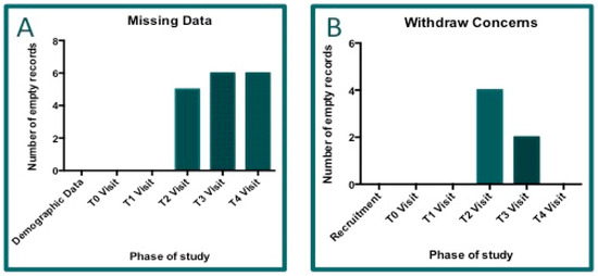 The information on absent data of clinical records is grouped in the two graphs reported below (Figure 5), where Figure 5A shows the total records distributed by visit, and Figure 5B indicates the number of patients not included in the global analyses due to the absence of data.