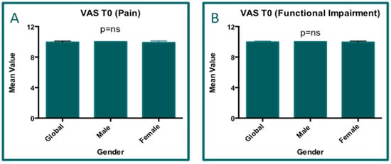 The baseline analyses for both pain and functional impairment (obtained based on the VAS scores) were performed with the Kruskal–Wallis (non-parametric) test. No statistical differences were found in both the pain and functional impairment rows according to the gender distribution. Both parameters showed mean values close to the maximum of the VAS score (mean VAS = 10). Below, the respective analysis results concerning pain (Figure 6A) and functional impairment (Figure 6B) at T0 are reported, according to which no statistical differences between males and females could be confirmed. Therefore, the results suggest that the differences in the patient-reported VAS scores might be dependent on the general condition of the patients and not influenced by gender, age, or BMI. Notably, data for HB and BT patients alone showed no difference in mean and standard deviation distribution (Table 1).