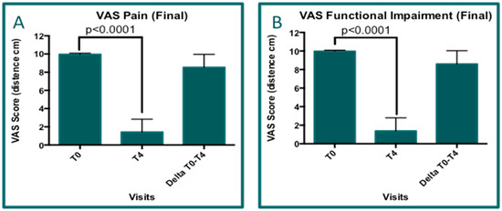 Graph (A): VAS analysis results for pain. Delta = 8.541 ± 1.429 (final visit T4 and delta value with respect to T0); p < 0.0001. Graph (B): VAS analysis results for functional impairment. Delta = 8.598 ± 1.441 (final visit T4 and delta value with respect to T0); p < 0.0001.