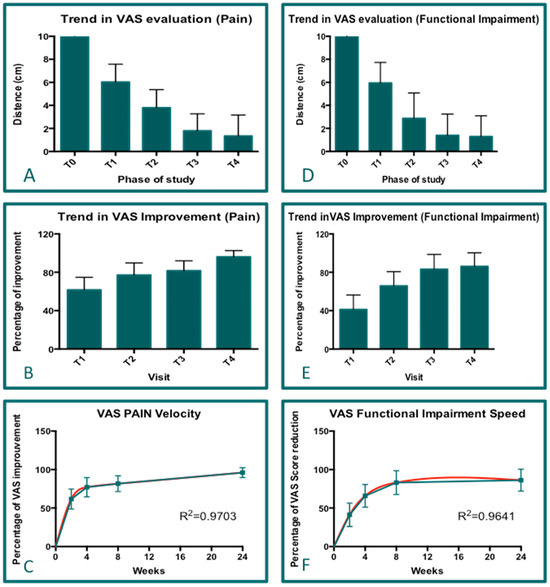 The cumulative analysis results of the VAS (pain and functional impairment) for all visits. Graphs (A–C) show the statistical data for pain, while graphs (D–F) show the statistical data for functional impairment. Graphs (A,D): The analysis results and description of the VAS (trends among the visits; p < 0.0001). Graph (B,E): The evaluation of VAS improvement (delta of the VAS with respect to T0; p < 0.0001). Graphs (C,F): The calculation of VAS improvement speed is based on the VAS score variation per week. The green line shows the connecting line among the points, while the red line demonstrate the R2 analysis (C,F).
