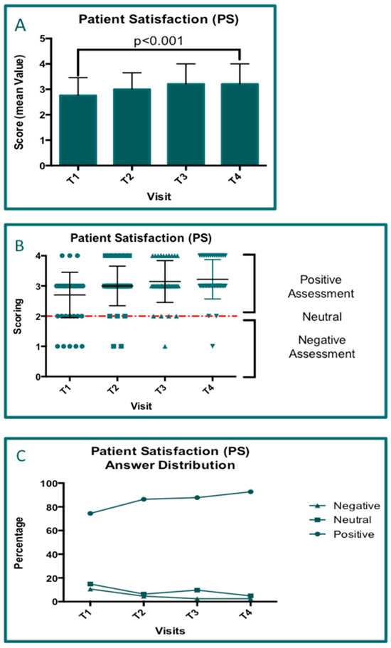 The results of the questionnaire concerning patient satisfaction (PS). (A) The bar graph shows the mean score value elaborated for each visit and the significative increase in PS over time. (B) A plot graph representing the distribution of the scores according to five levels of satisfaction grouping the patients who made positive and negative assessments. (C) A graph showing the percentages of the PS distribution across all visits.