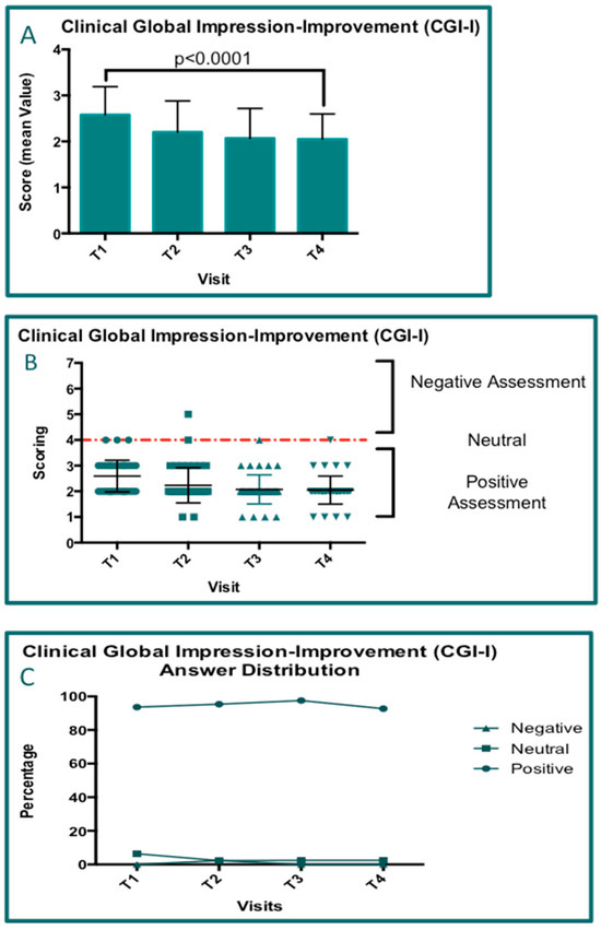 The results of the questionnaire concerning Clinical Global Impression—Improvement. (A) The bar graph shows the mean score value elaborated for each visit and the significative increase in CGI-I over time. (B) A plot graph representing the distribution of the scores according to seven levels of satisfaction grouping the patients who made positive and negative assessments. (C) A graph showing the percentages of the CGI-I distribution across all visits.