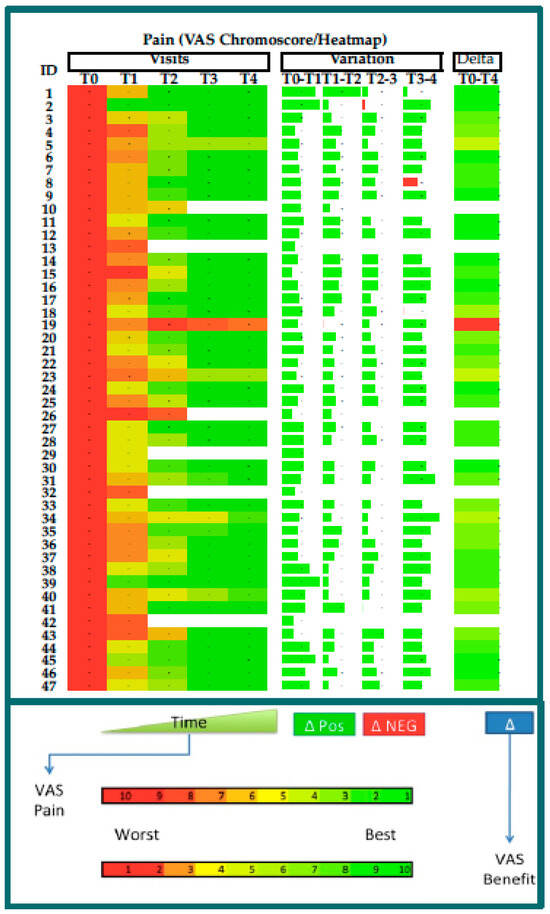 Heatmap representation of VAS data concerning pain analysis (p = 0.0001). Top left: singular interpretation of chromo-score for each visit. Top center: delta evaluation between consecutive visits, where width of bar means delta value. Green color represents positive changes (benefits). Red color represents negative differences (minus). Global variation in VAS (delta; top-right column) is represented according to chromo-score bar (bottom of panel).