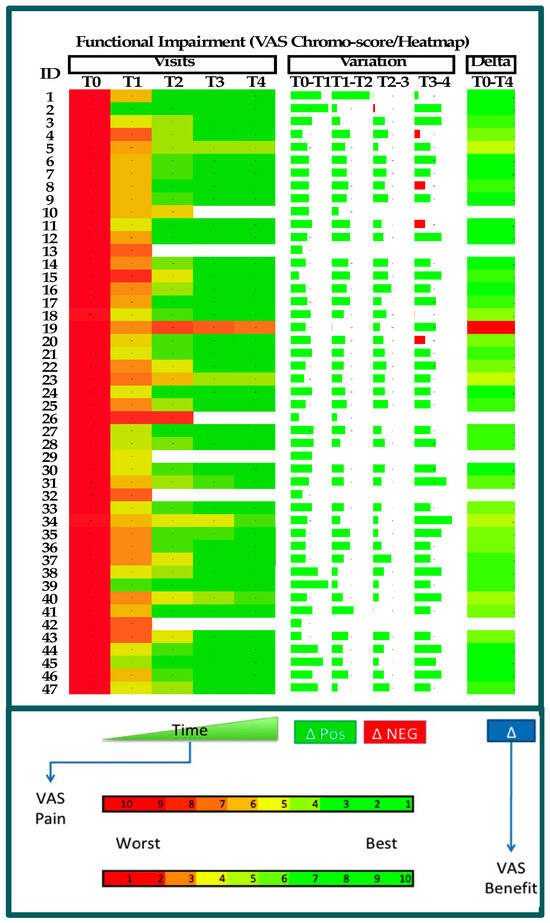 Heatmap representation of VAS data concerning functional impairment analysis (p = 0.0001). Top left: singular interpretation of chromo-score for each visit. Top center: delta evaluation between consecutive visits, where width of bar means delta value. Green color represents positive changes (benefits). Red color represents negative differences (minus). Global variation in VAS (delta; top-right column) is represented according to chromo-score bar (bottom of panel).
