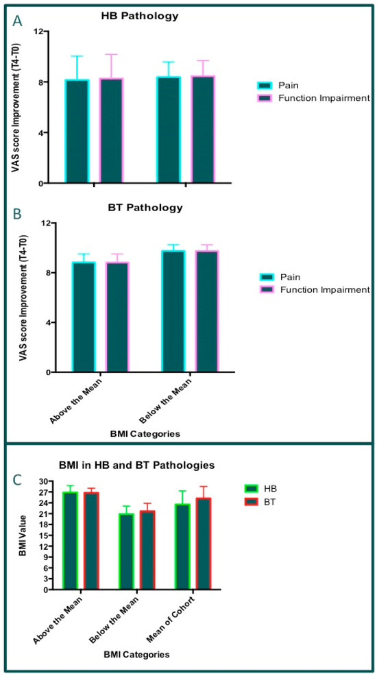 According to both statistical reports, we tried to ascertain the presence of a difference in terms of body mass index (BMI) values (as reported in Figure 3C) in the patients treated for the considered pathologies. ANOVAs were carried out by comparing BMI and the two most frequent pathologies in patients treated with PN HPTTM, i.e., HB (hip bursitis) and BT (biceps tendinitis), as reported in Figure 3. The two pathologies were investigated separately, and the patients were sorted into two groups by the BMI value (upper or lower group, with respect to the mean value of BMI). In the BT group (10 patients), there were six patients showing a BMI value above the mean and four patients showing a BMI value below the mean. Furthermore, in the HB group, including 26 patients, there were 13 in both BMI groups (above and below the mean BMI value). The ANOVA tests did not reveal significant differences when comparing the mean BMI score values in both BT and HB patients (Figure 13A,B). Next, the global differences in the VAS score (T4–T0) were evaluated for both pain and functional impairment in the two most common pathologies treated with PN HPTTM (BT and HB). According to the BMI partition, no significant statistical difference was discovered with ANOVA in these subgroups of patients (p = ns). The global VAS improvements in pain and functional impairment were the same in both groups of patients (sorted by BMI and pathology). This statistical evaluation is reported in Figure 13C. However, the statistical results indicate that BMI values lower than the mean were found in the group of patients showing greater improvement in both pain and functional impairment in BT (the differences were not significant). Finally, no significant differences were found in the HB subgroup of patients.