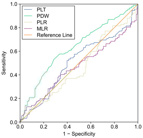 Figure 1 shows the ROC analysis for the discriminatory power of platelets, PDW, PLR, and MLR for CANOs. The ROC analysis showed that PDW had the highest discriminatory power among the variables analyzed (AUC: 0.633; 95% CI: 0.559–0.707; p = 0.001). The optimal cut-off point for PDW was calculated to be 13.15, at which a sensitivity of 60.9% and a specificity of 58.0% were found. On the other hand, the variables platelet (PLT), PLR, and MLR (AUC values of 0.507, 0.471, and 0.472, respectively) were found to have no significant discriminatory power.