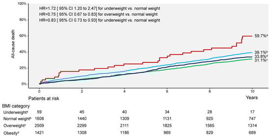 Continuous data with skewed distribution are presented as the median with 25th–75th percentiles and compared with the Kruskal–Wallis rank sum test. The distribution pattern of continuous variables was tested with the Kolmogorov–Smirnov test. Categorical data are presented as counts and proportions and compared with the chi-squared test. The primary endpoint (all-cause deaths at 10 years) was presented as cumulative incidence according to the Kaplan–Meier method. The other outcomes are shown as cumulative incidences after accounting for competing risk of death. Differences between the groups according to the BMI cut-offs were assessed using the univariable Cox proportional hazards model. The association of BMI with 10-year outcomes was adjusted in the multivariable Cox proportional hazards model. The following variables were entered into the model: BMI (as a continuous or category variable), patient’s age, gender, type 2 diabetes, current smoking, history of arterial hypertension, history of hypercholesterolemia, prior myocardial infarction, prior coronary artery bypass graft surgery, clinical presentation (acute coronary syndrome or chronic coronary disease), extent of angiographic CAD, estimated GFR, target coronary vessel, lesion complexity and left ventricular ejection fraction. BMI was entered into the multivariable model(s) as a continuous or category variable (in different Cox proportional hazard models). Incomplete baseline data were imputed using the predictive mean matching. The interaction testing was used to assess whether there are differences in the association of BMI (dichotomized at 25 kg/m2) with outcomes in subgroups of patients according to age (<75 years vs. ≥75 years), sex (women vs. men), diabetes mellitus (with vs. without diabetes) and clinical presentation (acute coronary syndrome vs. chronic coronary disease). The restricted cubic spine regression analysis was used to assess a potentially nonlinear association between BMI and 10-year mortality. The BMI was entered as 18.5, 25 and 30 kg/m2 knots. The C-statistic of the multivariable Cox proportional hazards models without BMI (with baseline variables) and with inclusion of BMI (baseline variables plus BMI) was calculated to assess whether the discrimination for mortality was improved by the inclusion of BMI into the model. The C-statistics of the mortality models with and without BMI were compared with the CompareC package. The R 4.1.0 Statistical Software (The R Foundation for Statistical Computing, Vienna, Austria) was used for statistical analysis. The statistical significance was defined at a two-sided p value of <0.05.